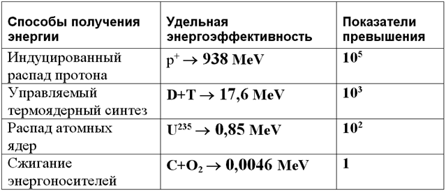 В реакциях деления и синтеза ядер в тепло и излучение превращается от 0,1 до 0,5 процента вещества. При химических реакциях эта величина составляет всего лишь одну десятимиллионную часть (10-7) [5]. При распаде каждый протон выделяет около 938 MэВ энергии. При этом происходит полное превращение его в энергию без образования остаточного вещества. В таблице 2 приведены приближенные значения показателей эффективности различных способов получения энергии по отношению к способам, основанным на химических реакциях.