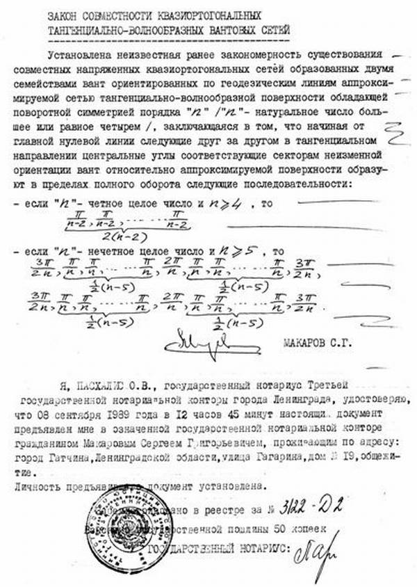 Приведенное критиком утверждение «Каждый результат таких исследований можно назвать открытием, или, более скромно, текущим достижением.» является абсолютно ложным утверждением. Я не поленился и обследовал книгу Теоретическая механика, статика, на которую ссылается критик, и авторитетно утверждаю, что фразы «Каждый результат...», которая приведена выше, в этой книге просто нет, там ни разу не встречается даже слово «открытие», что не удивительно: сама эта книга – пособие для студентов по выполнению практических заданий по статике. Поскольку критику юридическое понятие «научное открытие» просто не было известно, он и задает вопрос: «...в чем именно принципиально отличается описываемая работа, названная как "открытие" от множества подобных?». Да вот именно этим и отличается (см. определение научного открытия). Никакие «исследования прикладного характера» открытиями не являются. Чуть глубже надо вникать в исследуемый вопрос. Ссылаясь на открытие Макарова критик указывает: «Там говорится о специфическом сочетании приложения сил в сетчатой конструкции.» С сожалением констатирую: это тоже абсолютно ложное утверждение критика. Ни о силах, ни об их сочетаниях там не говорится вовсе. Не стоит «ловить рыбу в мутной воде». Ниже я приведу для русскоязычных читателей формулировку того же закона Макарова из другой его статьи Открытие в области механики, которая была опубликована ранее на русском языке «Агенством научно-технической информации»: