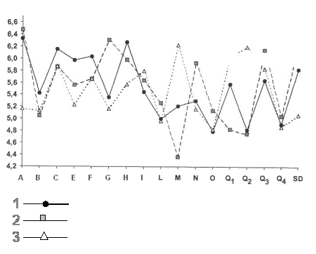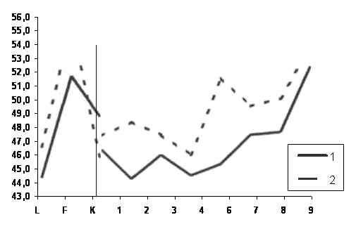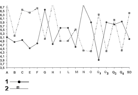 Уровень «внутренней поддержки» ценностей на протяжении всего периода обучения также выше в исследуемой группе. Соответственно, система ценностных ориентации студентов, специализирующихся по психологии, в большей степени обусловлена действием механизма интернализации. Различия в механизмах формирования ценностной системы студентов исследуемой и контрольной групп подтверждаются также различиями в профиле теста СМОЛ (рис.20). Студенты, обучающиеся психологии, характеризуются более низкими результатами по всем основным шкалам СМОЛ, что свидетельствует о меньшем напряжении адаптационных механизмов. Наиболее существенные различия (таблица 47) при этом обнаруживаются в