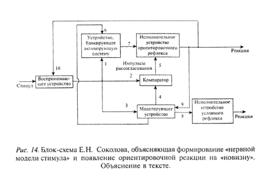Воспринимающее устройство → компаратор (сравнивает с моделирующим устройством) → исполнительное устройство ориентировочного рефлекса (запускается, если модель недостаточно совпадает с оригиналом, причём, чем больше расхождение, тем сильнее ориентировочная реакция).