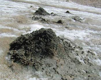 На поверхности ледников он может быть в виде сплошного покрова (как правило, это на языковых частях ледников), либо в виде пятен и полос (рис. 2). Встречаются и более мощные скопления эолового мелкозема с образованием конусов высотой до 0,5-1,0 м с ледяным стержнем по форме в виде муравьиных куч (рис. 2).