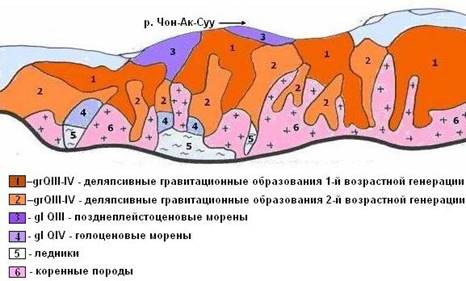 Рис 6. Карта четвертичных отложений правого борта долины р. Чон-Ак-Суу, составленная с применением количественных генетических показателей.