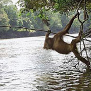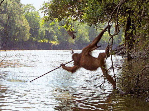 Один самец догадался использовать оставленную человеком "жердь" в роли копья. Он взобрался на ветки, свисающие над водой, и попытался протыкать палкой рыбу, плавающую внизу. Увы, добыть рыбу таким способом ему не удалось. Но это и не так уж важно. Зато при помощи того же самого инструмента этот орангутан успешно выуживал плавающие плоды, упавшие в реку.