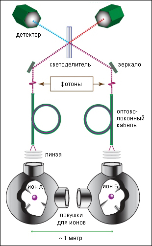 В начале эксперимента ионы (назовем их А и Б) находились в одном из основных состояний. Затем на ион А направлялось микроволновое излучение, испускаемое одним из электродов; в результате кубит оказывался в некоторой суперпозиции своих собственных состояний (происходила запись информации для передачи). Сразу после этого оба иона возбуждались лазерным импульсом пикосекундной длительности. Возврат в одно из основных состояний — «значений» кубита — проходил с испусканием фотонов, «цвет» которых (красный или синий), соответствовавший разным длинам волн, однозначно определял конкретное значение. Затем фотоны с помощью линз направлялись по оптоволоконному кабелю к светоделительному элементу; при попадании на него каждая частица могла либо отразиться, либо пройти напрямую (вероятности этих событий одинаковы). По обеим сторонам светоделителя располагались детекторы.