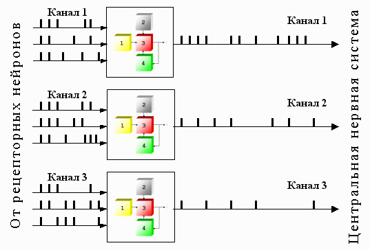 Рис. 6. Принципы обработки сигналов в промежуточных нейронах сенсорных каналов различной модальности