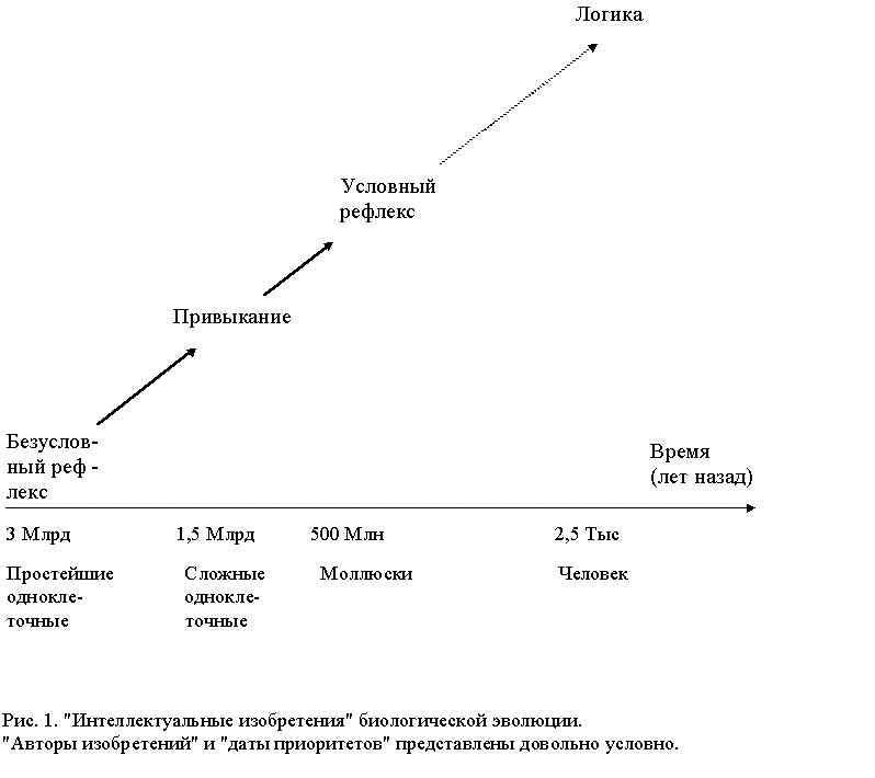 Итак, можно выделить несколько ключевых "изобретений" и расположить их в последовательный ряд эволюционных достижений [6] (рис.1). В этом ряду происходит постепенное усовершенствование "познания" закономерностей во внешнем мире. Отметим, что с целью достижения определенности и четкости мы сильно упростили схему развития "интеллектуальных изобретений". В действительности процессы обработки информации и познания закономерностей при “интеллектуальном” поведении животных разного эволюционного уровня, конечно же, значительно сложнее (см., например, [1-3,6,18-21,34]).