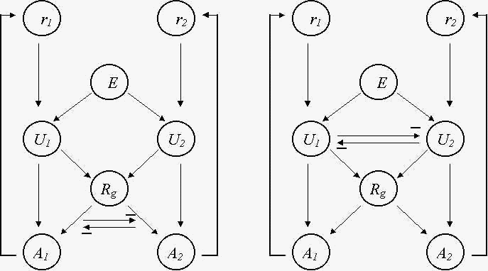 Рис. 3. Схема управления поведением, направленным на удовлетворение двух потребностей. Взаимное торможение осуществляется на уровне действий (а), либо на уровне управляющих блоков (б). ri - ресурсы потребностей, i = 1, 2; E - внешняя среда; Ui - управляющие блоки; Rg - общие ресурсы животного; Ai - действия, направленные на удовлетворение потребностей.