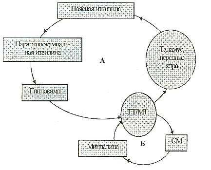 А – круг Пейпеца, Б – круг через миндалину, ГТ/МТ – мамиллярные (сосцевидные) тела гипоталамуса, СМ – средний мозг