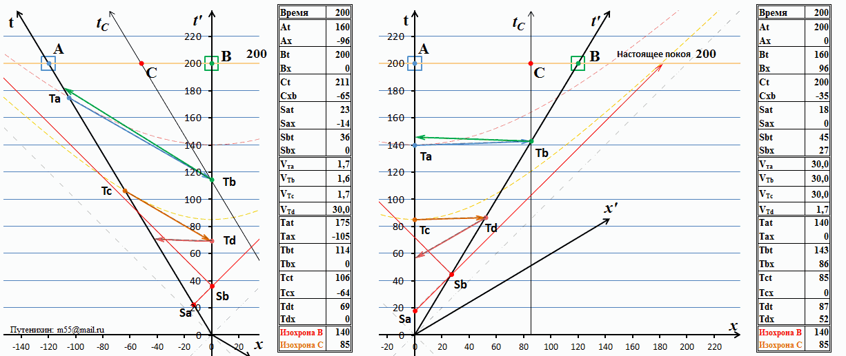 В полном виде сеанс связи показан на правой стороне рисунка с точки зрения неподвижных наблюдателей А и С. Время будем отмерять в годах. В момент времени 140 лет между тахионными телеграфными узлами связи произведён многократный обмен сигналами, информацией. Как видно на диаграмме, никаких логических противоречий при этом не возникает. Время по часам А и С – это какой-либо день по истечению 140 лет движения системы В. Очевидно, что за это время он удалился от А на расстояние 84 световых года. Вследствие релятивистского замедления темпа хода часов в системе В календарь и часы показывают время в какой-то день 113-го года (если отсчет дат велся с нуля). Хотя это и выглядит как передача сигнала «в прошлое», но это прошлое получателя, а не отправителя и никаких противоречий в этом нет.