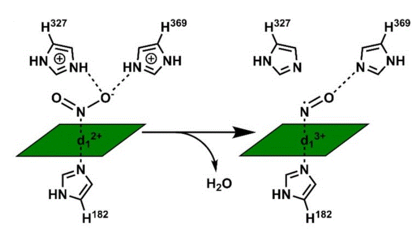 Рис. 2. Схема восстановления нитрита до оксида азота на геме d1, взято из статьи.