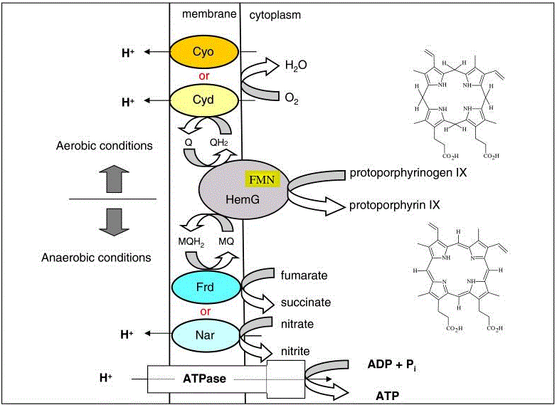 Теперь давайте вернёмся к главному предмету нашего интереса - основной ветке, которая идёт от уропорфириногена III вверх. Она, в свою очередь, раздваивается от молекулы протопорфирин IX. В зависимости от того, что вставляется в центр протопорфирина, мы далее вступаем либо на дорогу, ведущую к хлорофиллам и бактериохлорофиллам, либо на путь, ведущий к всевозможным вариантам гемов и пигментов антенн фотосинтеза и фоторецепторов цианобактерий и некоторых растений. В частности, простая вставка в протопорфирин IX иона железа сразу даёт нам классический гем b, пожалуй, наиболее широко распространённый из всех существующих гемов. Что касается пигментов антенн цианобактерий и фоторецепторов, то, они синтезируются, на первый взгляд, весьма странным образом. Из только что с таким трудом построенного гема b уже на следующем шаге опять вынимается ион железа, после чего он контролируемо деградирует до линейной цепочки, состоящей из четырёх пирролов (с боковыми звеньями), связанных между собой атомами углерода. Это соединение, которое называется биливердин IX, в зависимости от конечного пункта назначения, в свою очередь, подвергается дальнейшим небольшим модификациям. Такой окольный путь синтеза пигментов, необходимых для работы реакционных центров фотосинтеза, намекает, как минимум, на то, что в момент формирования соответствующей системы гем b уже активно участвовал в различных метаболических циклах. Если вместо железа в молекулу протопорфирина IX вставляется магний, дальнейший путь ведёт к синтезу всевозможных разновидностей хлорофиллов и бактериохлорофиллов. При этом, скорее всего, к моменту формирования аппарата хлорофилльного фотосинтеза гем b уже активно использовался в других метаболических цепочках (см. выше). Данное обстоятельство предоставляет возможность выдвинуть гипотезу о появлении хлорофилла в результате ошибочной вставки в протопорфирин IX иона магния вместо иона железа. Как это могло произойти? Известно, что сам протопорфирин IX синтезируется из своего предшественника - протопорфирогена IX путём изъятия у последнего сразу шести электронов. У части аэробных бактерий (включая большинство цианобактерий) эту работу выполняет содержащий в качестве кофактора гем b протеин, кодируемый геном HemJ, а у многих анаэробных и факультативно анаэробных бактерий аналогичная функция возложена на не родственный ему протеин, кодируемый геном HemG, и использующий в качестве кофактора флавин-мононуклеотид (сокращённо - FMN). Полученные от протопорфирогена IX электроны передаются затем на хиноны и вместе с ними направляются к встроенным в мембрану комплексам, передающим их, в свою очередь, конечным акцепторам (см. Рис. 3). Ими могут быть либо (в аэробных и микроаэробных условиях) восстанавливающие кислород до воды комплексы цитохром bo3 и/или цитохром bd, либо (в анаэробных условиях) восстанавливающая нитрат до нитрита мембранная нитрат редуктаза Nar или мембранный комплекс восстановления фумаратовой кислоты до янтарной Frd. Во всех вариантах, кроме использования в качестве окислителя фумаратовой кислоты, на этапе синтеза протопорфирина IX осуществляется запасание свободной энергии за счёт перекачки протонов из цитоплазмы в периплазму.