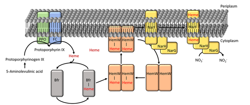 Рис. 4. Рисунок из вышеупомянутой , демонстрирующий, что вновь синтезируемые гемы b тут же связываются бактериоферритином и транспортируются для последующего использования на завершающем этапе синтеза субъединицы нитрат-редуктазы NarI, на структурном уровне являющейся почти полным аналогом классического цитохрома b(b6) в комплексах bc1 и b6f.